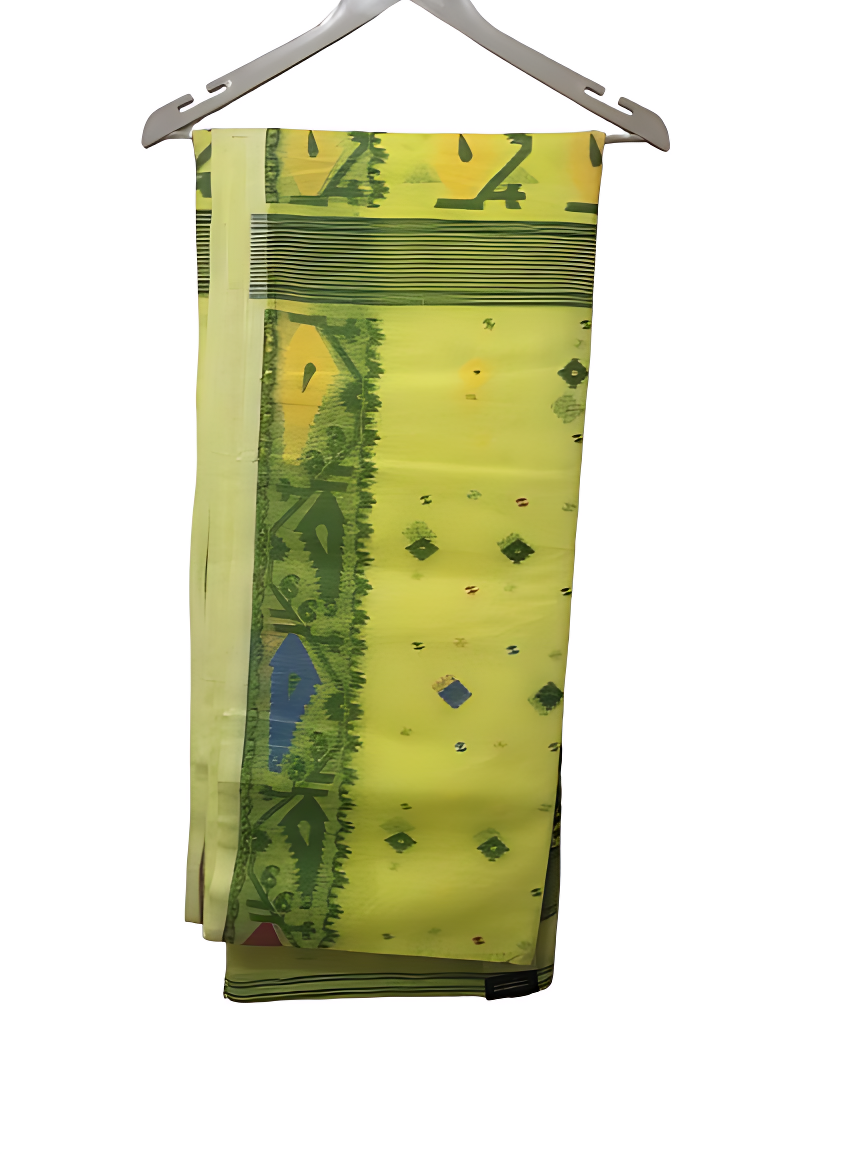 Artistry: Features the intricate Jamdani Weave, where patterns are hand-woven, giving the saree a rich texture and feel.1