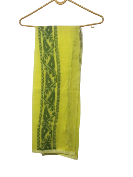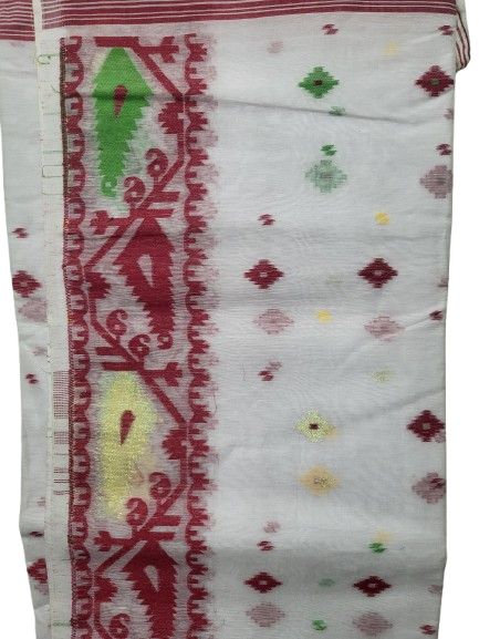 Discover the beautiful blend of comfort and traditional design with our stunning Cotton Jamdani Saree. This saree features a clean White Base illuminated by a vibrant Red and Yellow Geometric Pattern, showcasing the delicate artistry of the Jamdani weave on breathable cotton.