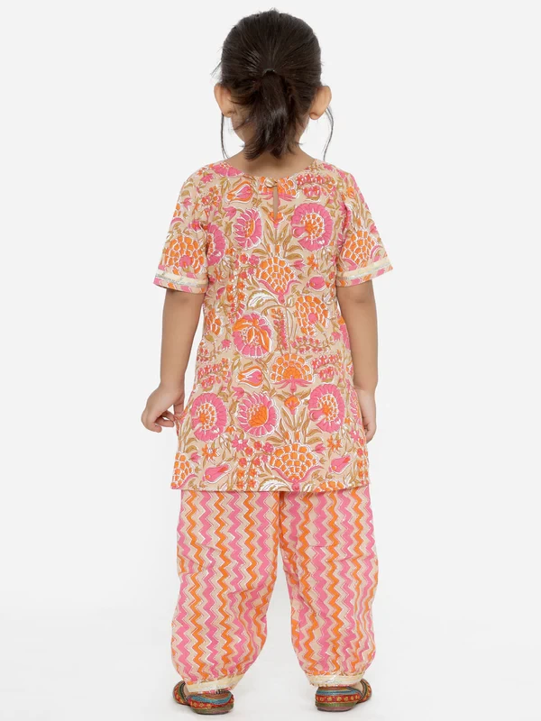 A Line Cotton Fabric Beige Color Floral Printed Kurta And Pyjama With Goat Work.