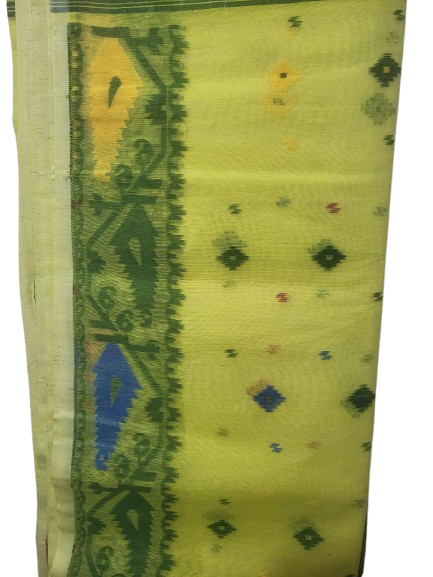 Artistry: Features the intricate Jamdani Weave, where patterns are hand-woven, giving the saree a rich texture and feel.1